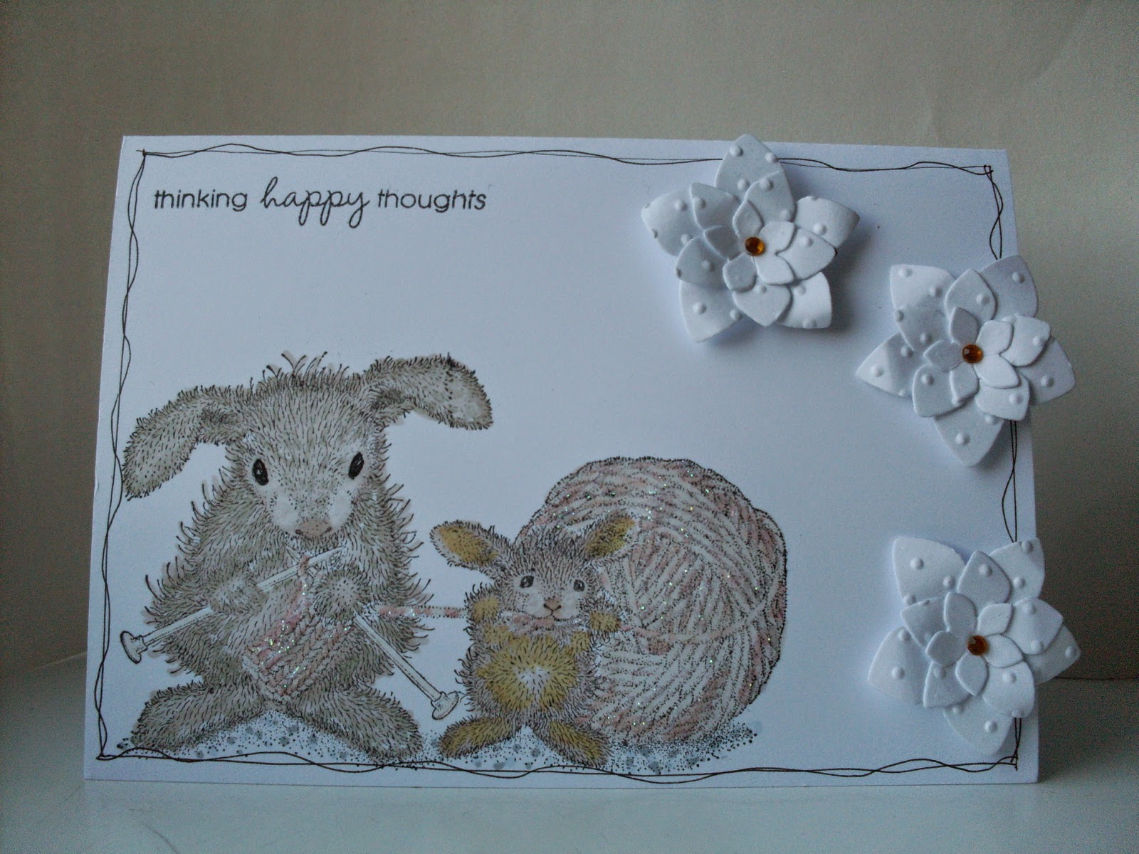Hi everyone. Today my card is using 'yarn tales' from HM, coloured with Promarkers and as you can see a single layer card, sentiment from Elzybells stamp, phlox flower dies, embossing and gems, some sparkle on the wool. I stamped some footprints on the inside too. I thought this would make a nice thinking of you card for October Cancer Awareness month...sending big hugs to anyone who is suffering from this awful disease. We all need to be there for one another. Challenges entered are only 8...Ribbon Girls, AAGWAT, Allsorts, CYP flowers, gems, dies, CCT, HM, Gruffies and Guests 2nd and Creative Knockouts. Sorry it's a quick post but I have a lot to get through today, many thanks for coming over, bye.